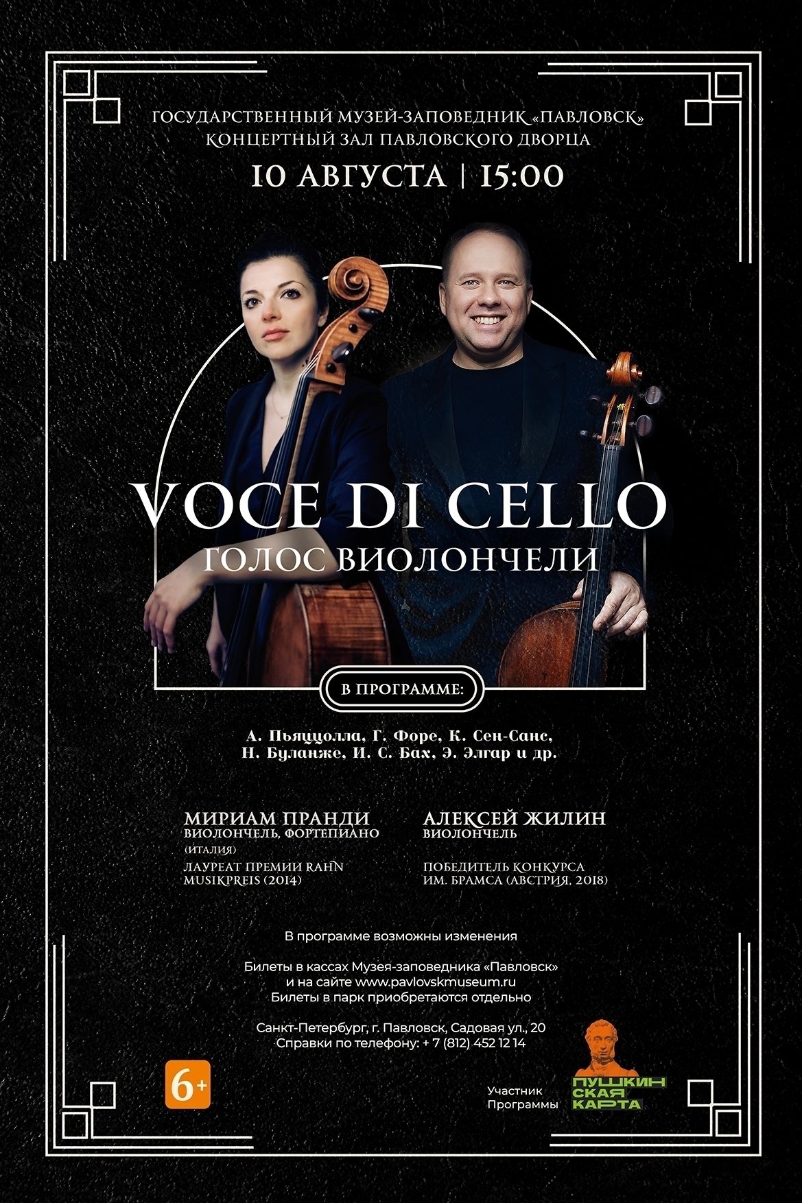 10 августа в Концертном зале Павловского дворца состоится концерт для ценителей классической музыки Voce di Cello (6+). Об этом сообщает пресс-служба Музея-заповедника «Павловск».