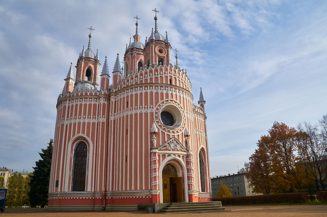Больше известен как Чесменская церковь. Храм построен в псевдоготическом стиле, автором проекта стал архитектор Юрий Фельтен. Церковь находится в Московском районе города, в стороне от главных магистралей. Когда-то она входила в комплекс с расположенным рядом Чесменским путевым дворцом. Но сегодня, глядя на эти два архитектурных сооружения, трудно представить, что их проекты принадлежат руке одного автора. Легкая ажурная бело-розовая церковь – и тяжелый с виду, выкрашенный в желтый цвет бывший дворец.