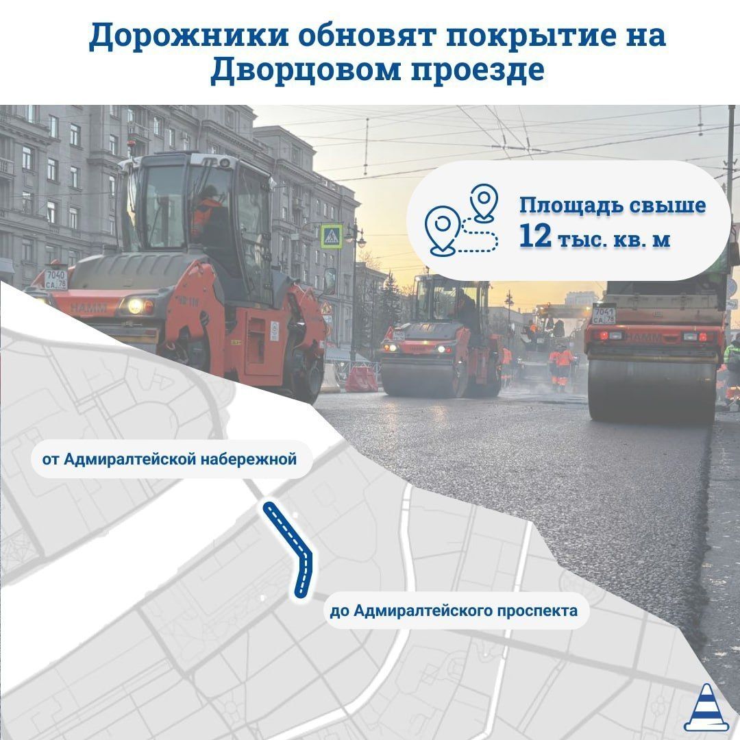 На участке от Адмиралтейской набережной до Адмиралтейского проспекта уложат свыше 12 тыс. кв. м нового асфальта. В рамках работ будут произведены ремонт люков колодцев и нанесение новой дорожной разметки.