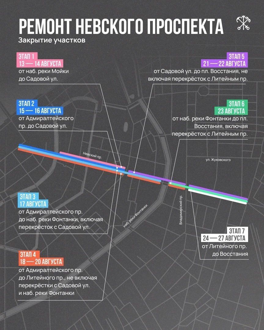 В рамках подготовительных этапов с 4 по 8 августа отремонтируют Дворцовый проезд, а с 6 по 12 августа – трамвайные пути на перекрестке Невского и Литейного проспектов. Часть полос будет открыта для движения.