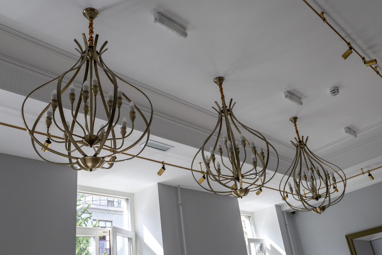 Весь интерьер, включая подобранные со вкусом люстры, шторы и мебель, создает атмосферу петербургского салона.