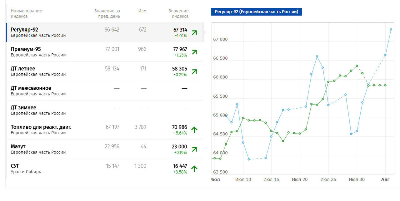 Бензин АИ-92 марки «Регуляр» также вырос в цене до уровня 67,314 тыс. рублей за тонну. Это на 1 % больше, чем 4 августа. Стоимость дизтоплива поднялась до 58, 305 тысячи рублей (+0,29% в цене).