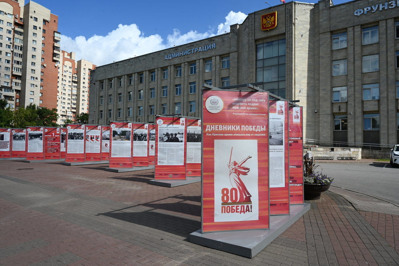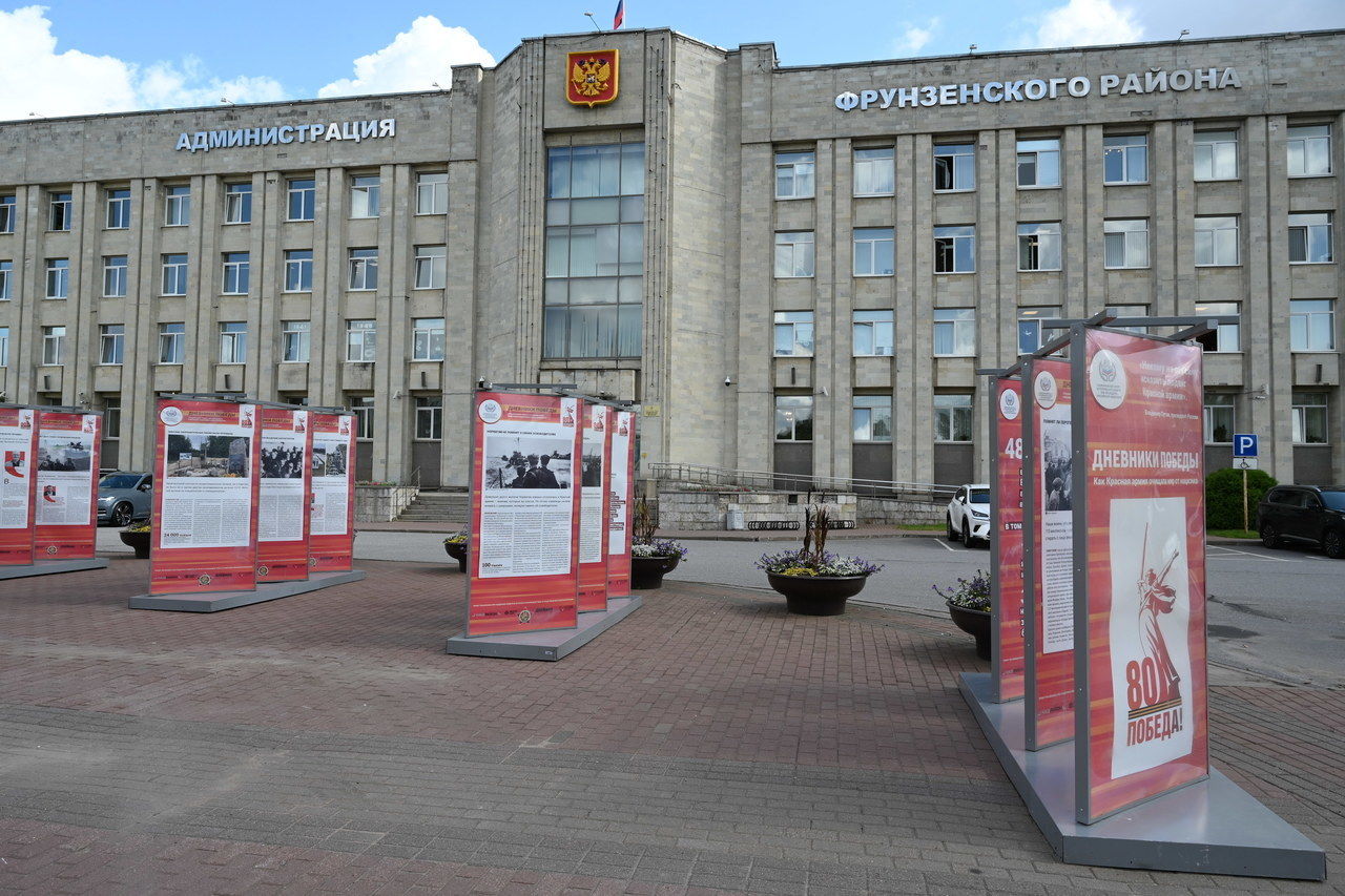 Выставка «Дневники Победы» уже работала на территории Петропавловской крепости и на берегу реки Охты. И вот сегодня экспозиция переместилась на Пражскую улицу, 46, где находится здание администрации Фрунзенского района.