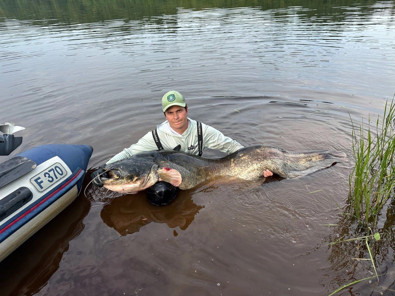 На реке Волхов житель Петербурга Назар Сушков поймал огромного сома. Длина рыбы составила около двух метров, а вес – около 65 килограммов.