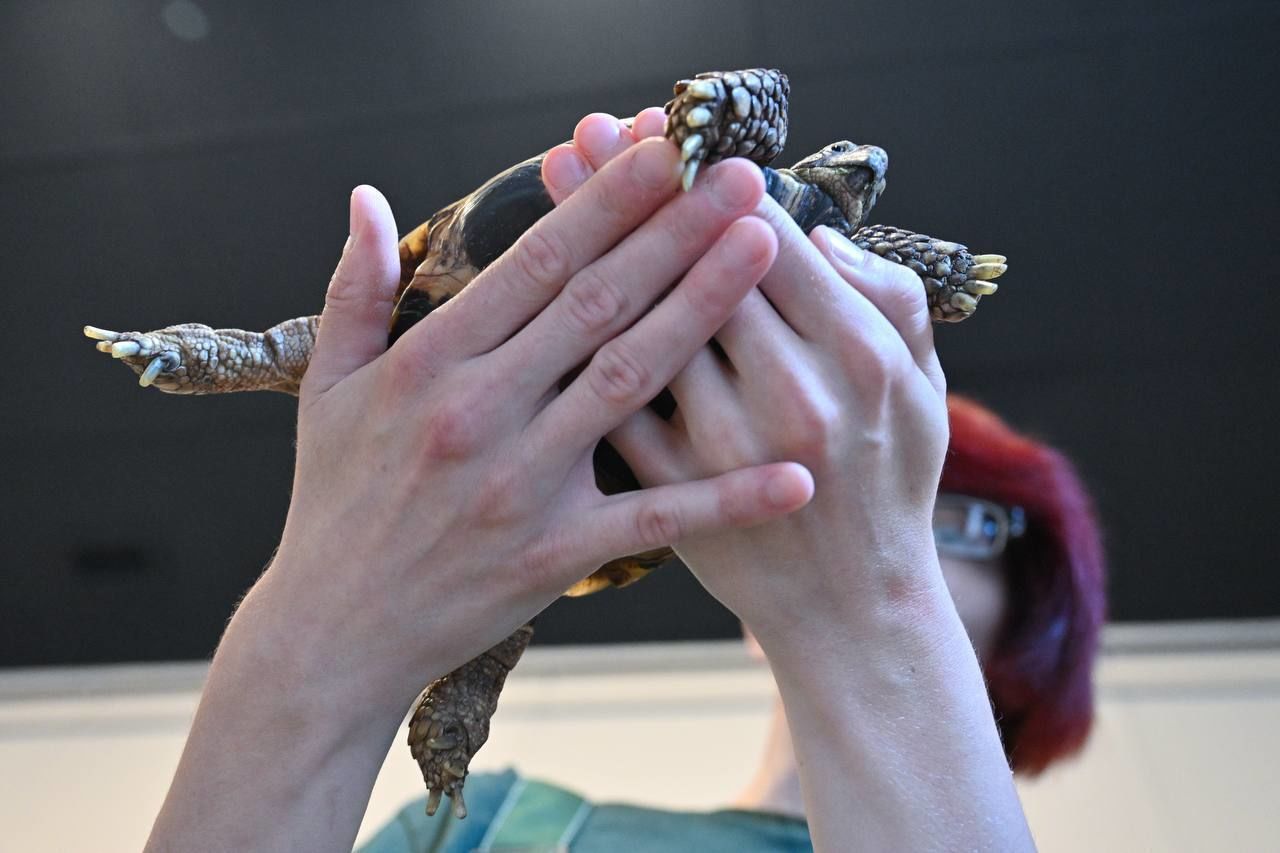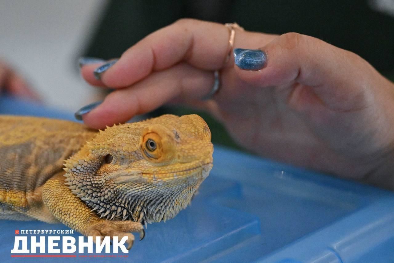 Специалисты привезли обитателей городского питомника в медиацентр «Культура Петербурга». В одном из террариумов – гондурасская молочная змея, примерно метр в длину. Неядовитая, но ловкая охотница: исследует пространство языком. Легко привлекает внимание своей окраской.
