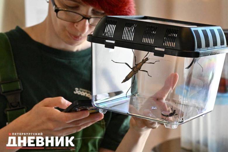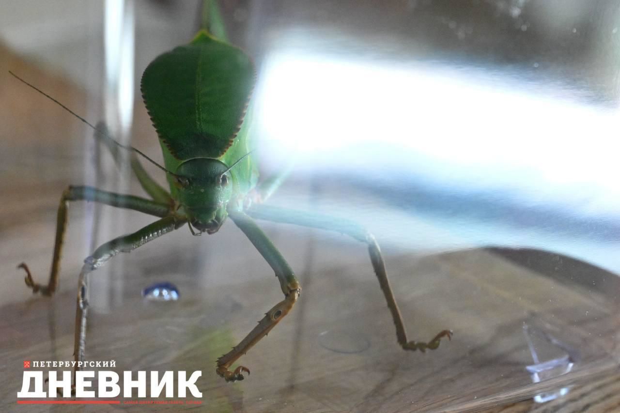 По соседству редкий и впечатляющий вид ящерицы длиной до 40 сантиметров. Рядом – кузнечик из Новой Гвинеи. Ему меньше года, длина тела – 12 сантиметров, а с усами – все 19. Настоящая тропическая аристократка Ленинградского зоопарка – королевский питон Плюша. Ей 20 лет, а вес около 10 килограммов. Плюша находится в десятке самых больших змей зоосада.