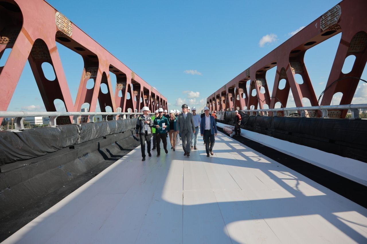 На путепроводе через Московское шоссе завершены монтаж металлоконструкций, установка плит проезжей части. Также начаты работы по окраске металлических конструкций и монтажу барьерного ограждения.