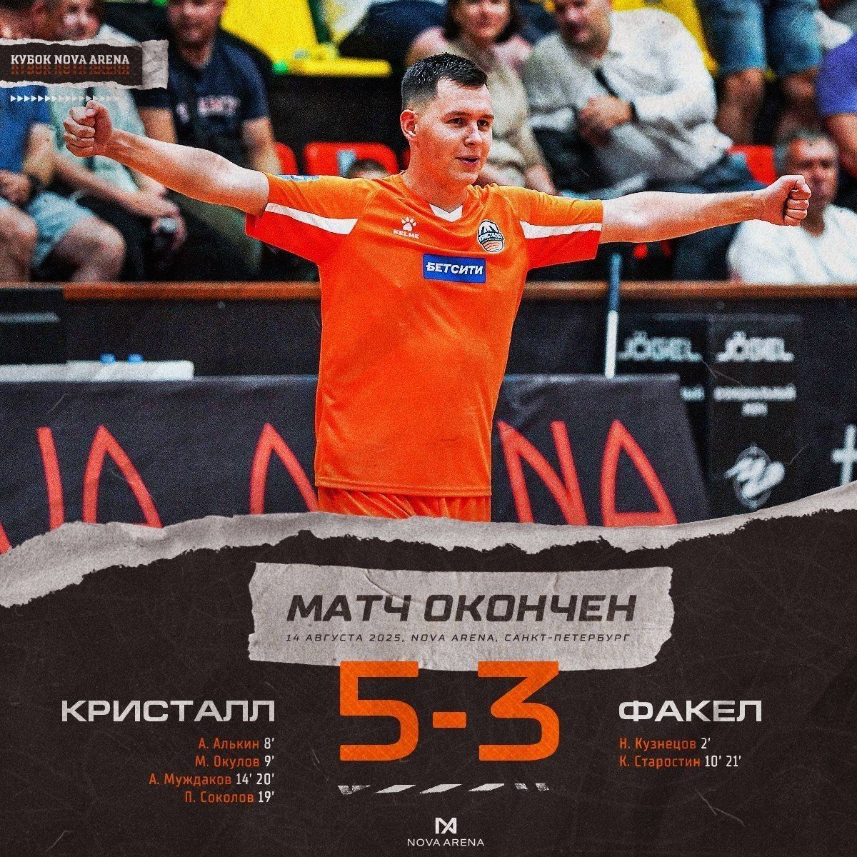 Футзальный клуб «Кристалл» начал предсезонный товарищеский турнир «Кубок Nova Arena» в Санкт-Петербурге победой над дебютантом Суперлиги, сургутским «Факелом», со счетом 5:3.