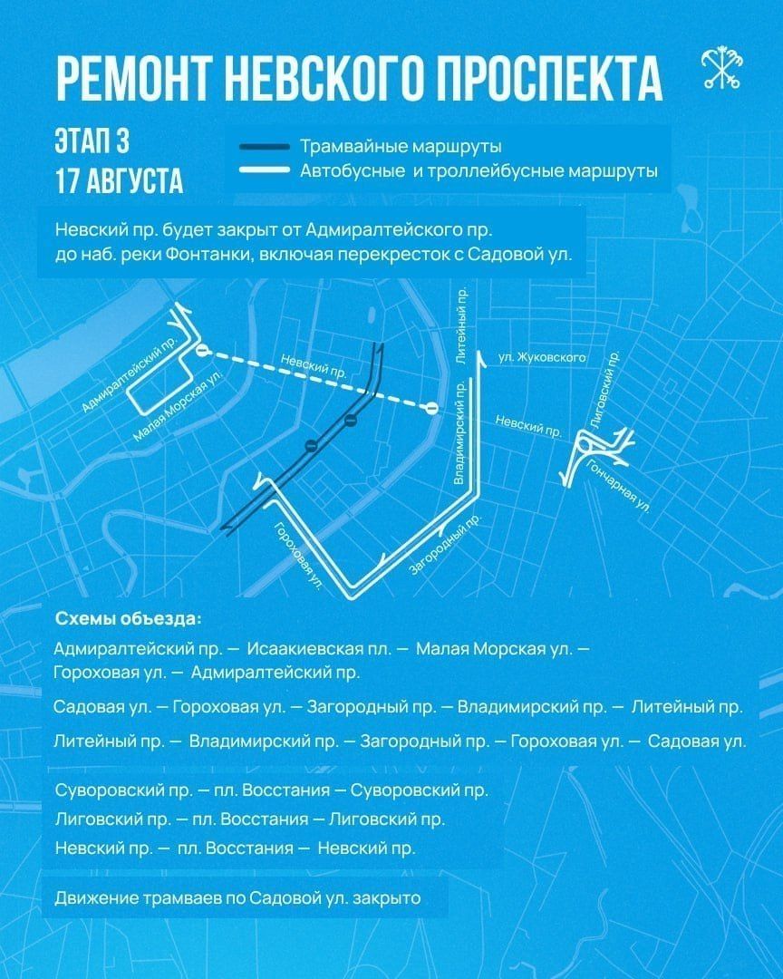 Начинается третий этап работ на Невском проспекте. Для движения будет закрыт участок от Адмиралтейского проспекта до набережной реки Фонтанки, сообщили в телеграм-канале «Дороги и мосты Петербурга».