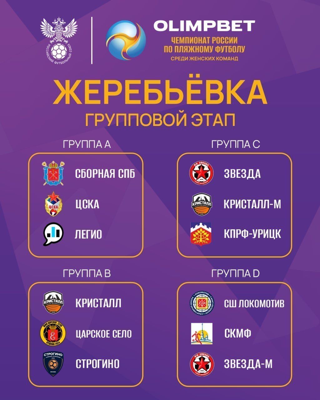 – Группа B: «Кристалл», «Царское Село» (Ленобласть), «Строгино» (Москва).