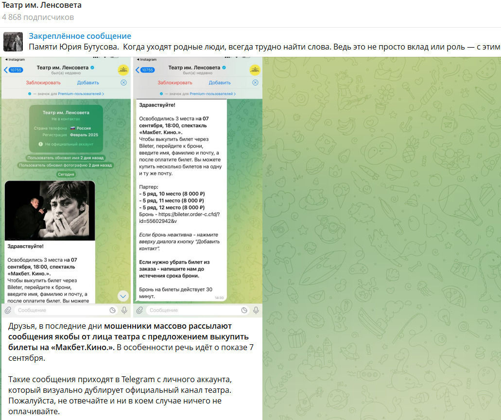 «В последние дни мошенники массово рассылают сообщения якобы от лица театра с предложением выкупить билеты на «Макбет.Кино». В особенности речь идёт о показе 7 сентября. Такие сообщения приходят в Telegram с личного аккаунта, который визуально дублирует официальный канал театра», – сообщили в официальном телеграм-канале театральной площадки и попросили не отвечать на сообщения и ничего не оплачивать.