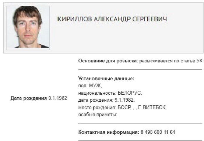 «Кириллов Александр Сергеевич. Основание для розыска: разыскивается по статье УК», – говорится на сайте МВД РФ.