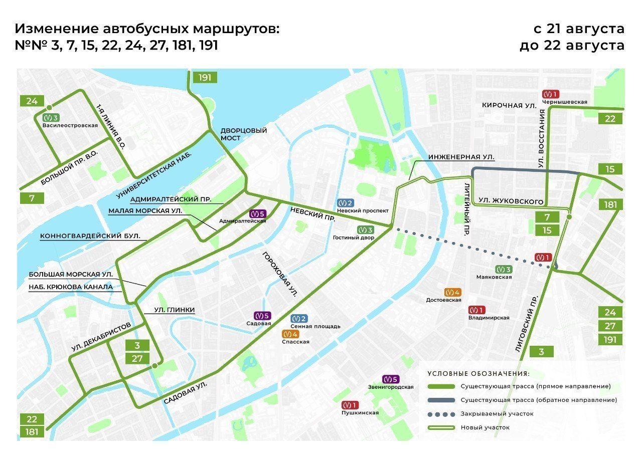 В связи с дорожными работами на Невском проспекте с 00:00 21 августа до 23:00 22 августа изменятся трассы восьми автобусных маршрутов. Так, изменения коснутся автобусных рейсов под номерами №3, 7, 15, 22, 24, 27, 181, 191.