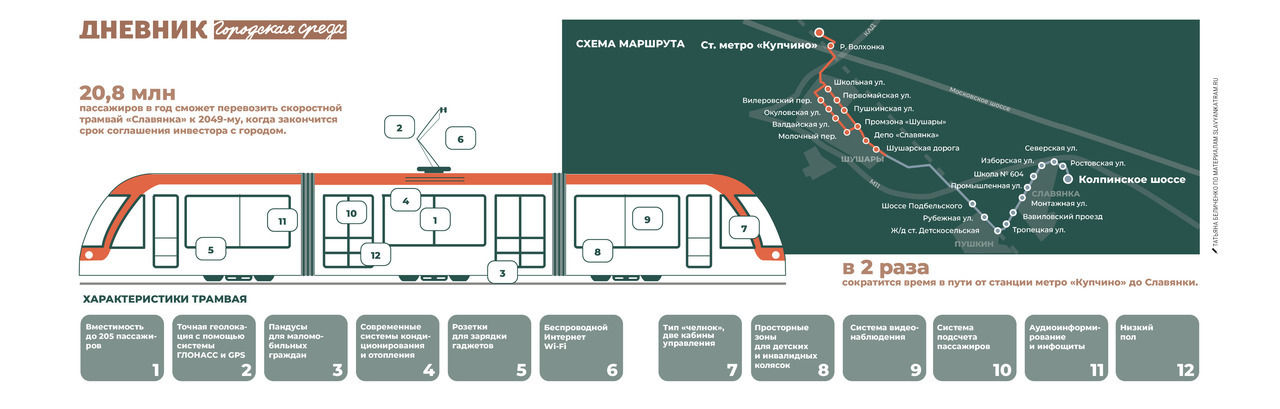 20,8 млн пассажиров в год сможет перевозить скоростной трамвай «Славянка» к 2049-му, когда закончится срок соглашения инвестора с городом. В два раза сократится время в пути от станции метро «Купчино» до Славянки.