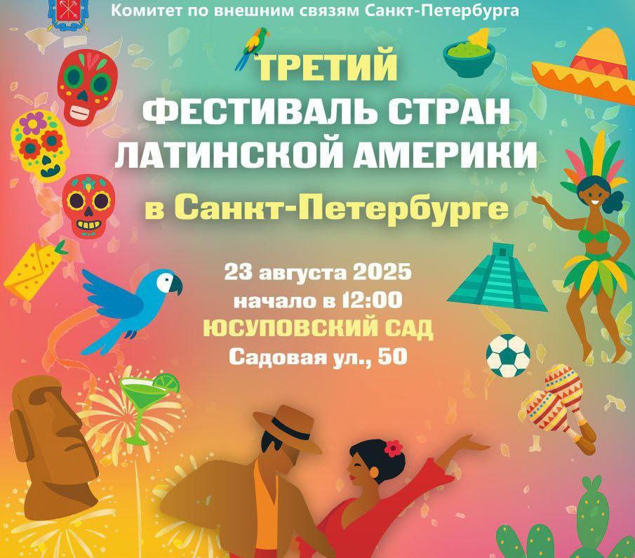 В эту субботу, 23 августа, в Санкт‑Петербурге вновь пройдет главный латиноамериканский праздник нашего города – третий Фестиваль стран Латинской Америки. Об этом сообщили в Комитете по внешним связям Северной столицы.
