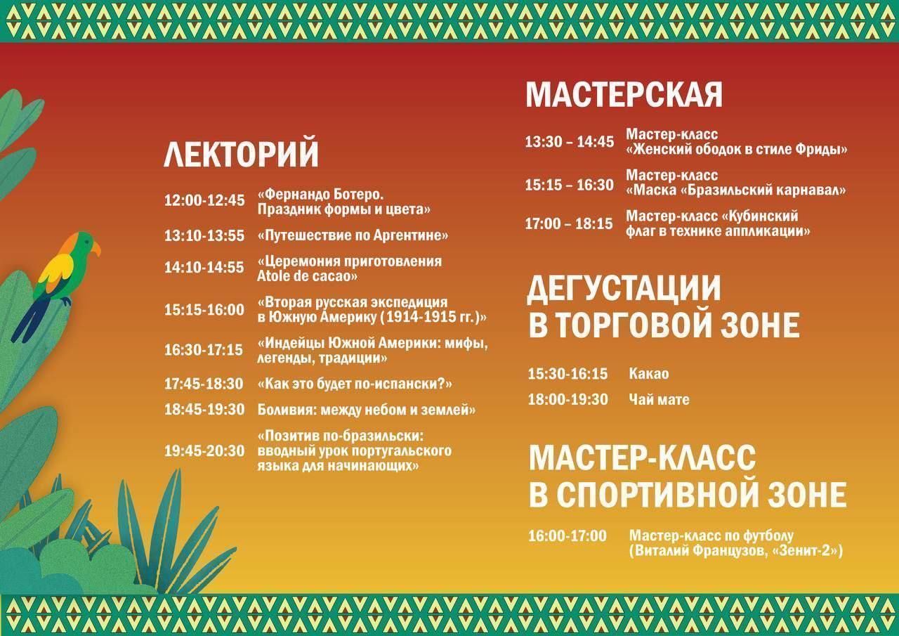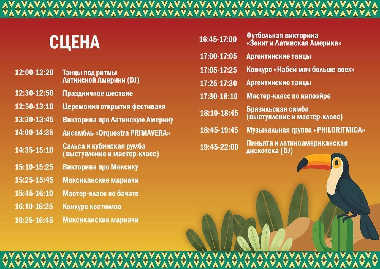 Жители и гости города смогут окунуться в атмосферу настоящего карнавала, насладиться великолепной латиноамериканской кухней, попробовать свои силы в зажигательной сальсе и румбе, узнать об истории и традициях стран региона Латинской Америки.