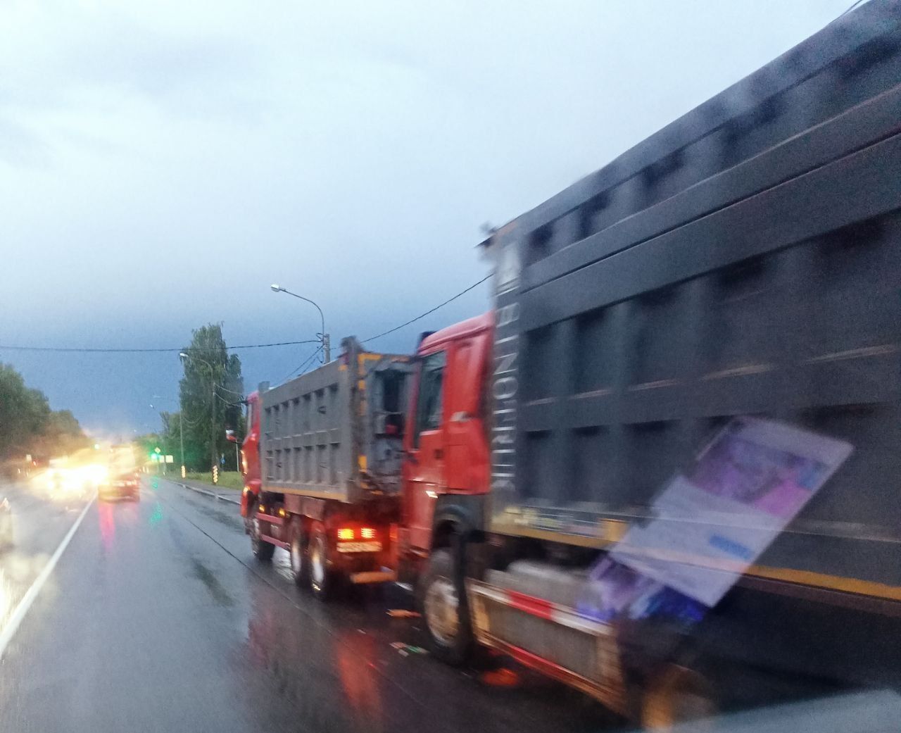 Судя по опубликованным кадрам, грузовики заняли одну полосу движения.