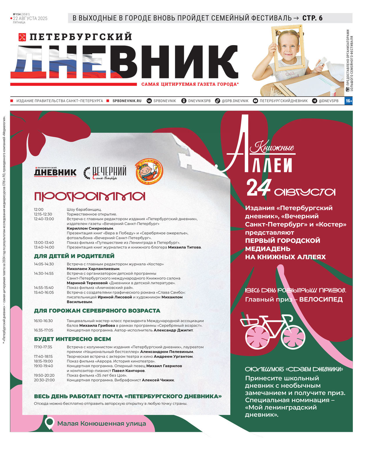 «Мы готовим медиадень как большой праздник для горожан, где мы впервые объединим сразу три наших издания – «Петербургский дневник», «Вечерний Санкт-Петербург» и журнал «Костер». Будут книги, музыка, встречи с писателями и журналистами, лекции для детей и взрослых. И конечно – конкурсы. Например, флешмоб «Сдаем дневники»: накануне 1 сентября мы ищем самые смешные и остроумные записи учителей в школьных дневниках. Самые интересные покажем в тематическом выпуске «Петербургского дневника» к предстоящему Дню знаний. А специальной номинацией в этом конкурсе станет «Мой ленинградский дневник», – рассказал главный редактор «Петербургского дневника» Кирилл Смирнов.