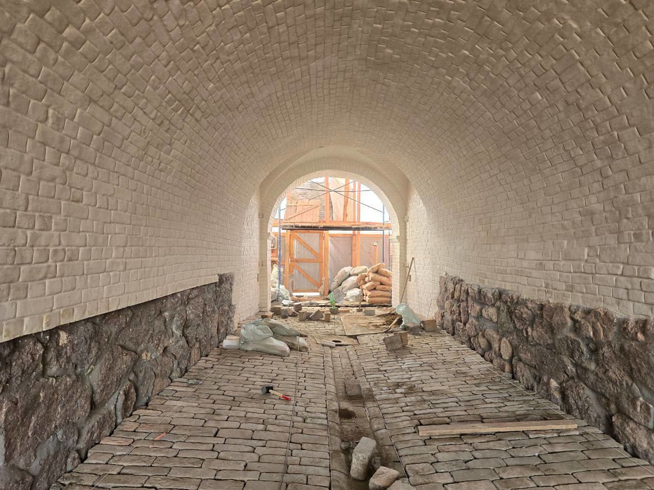 На Равелинных воротах заканчивается внешняя отделка фасадов, положена штукатурка, после будет покраска. А также заканчивают восстановление мощения воротного проезда.