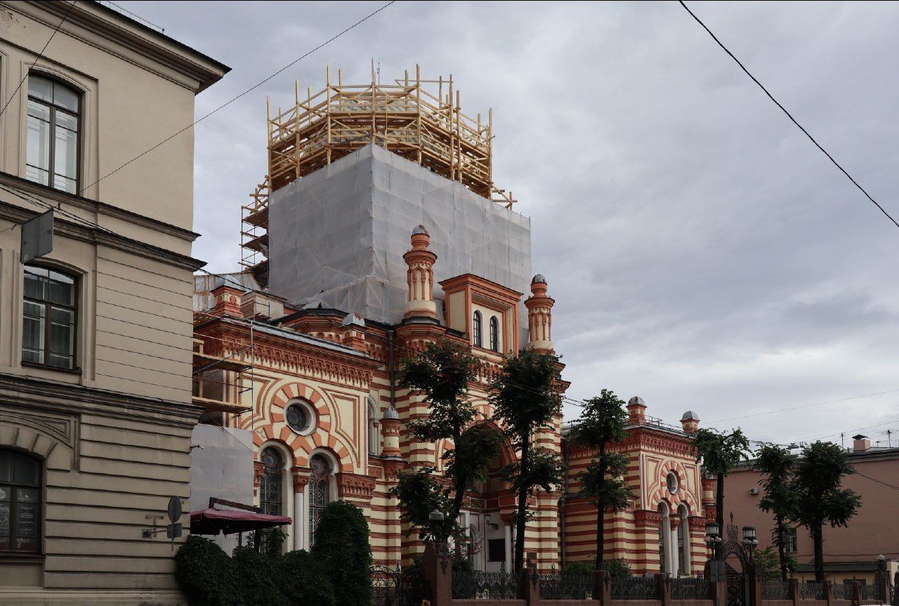 Строительные леса постепенно возводятся на фасадах исторического здания Большой Хоральной Синагоги в Санкт-Петербурге. Специалисты приступили к комплексной реставрации одного из значимых архитектурных памятников города.