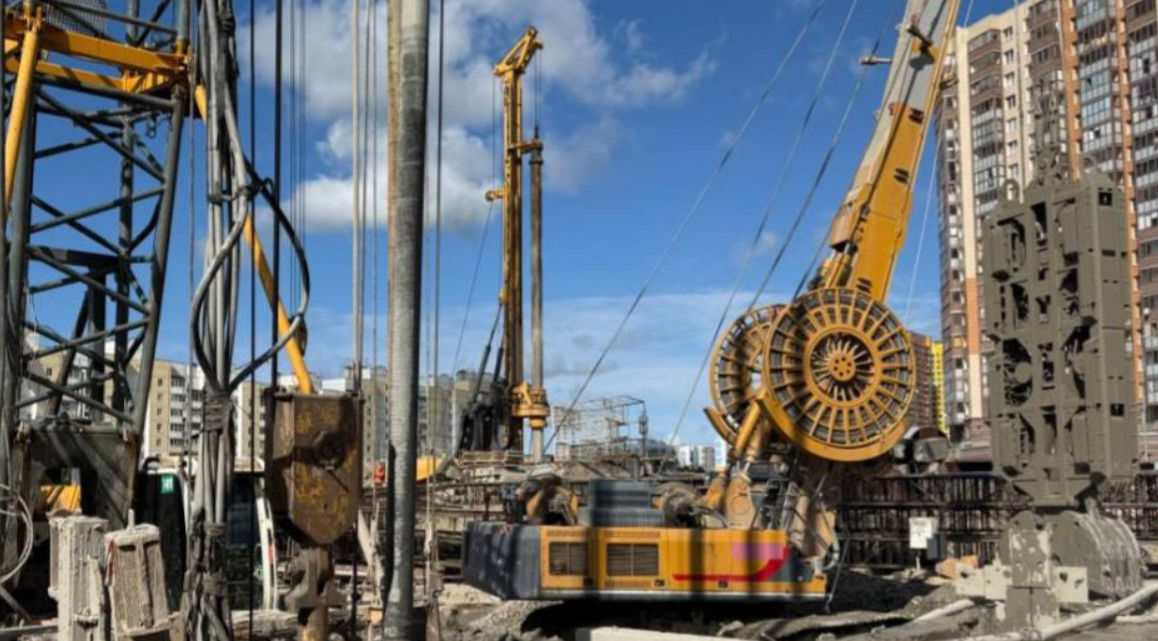На стройплощадке рядом с пересечением Комендантского и Шуваловского проспектов ведутся работы по сооружению стены в грунте по периметру станции.