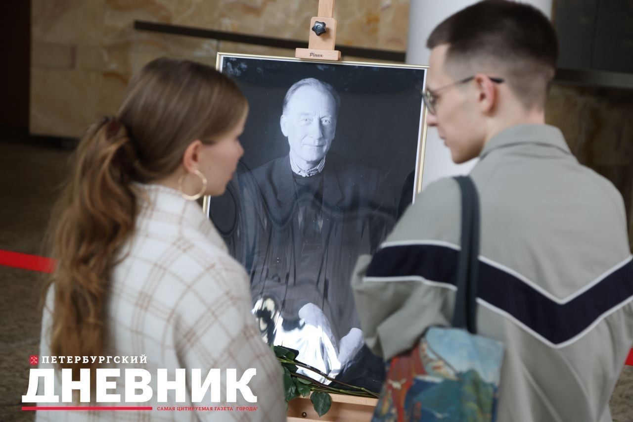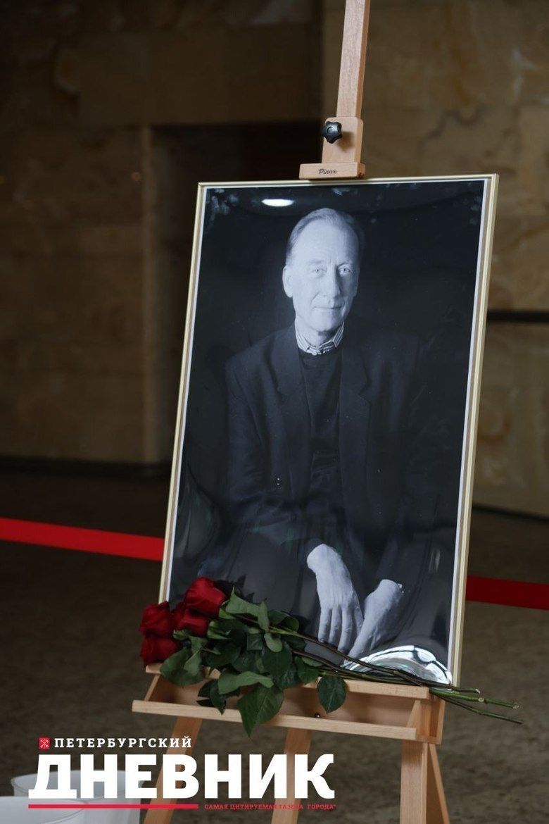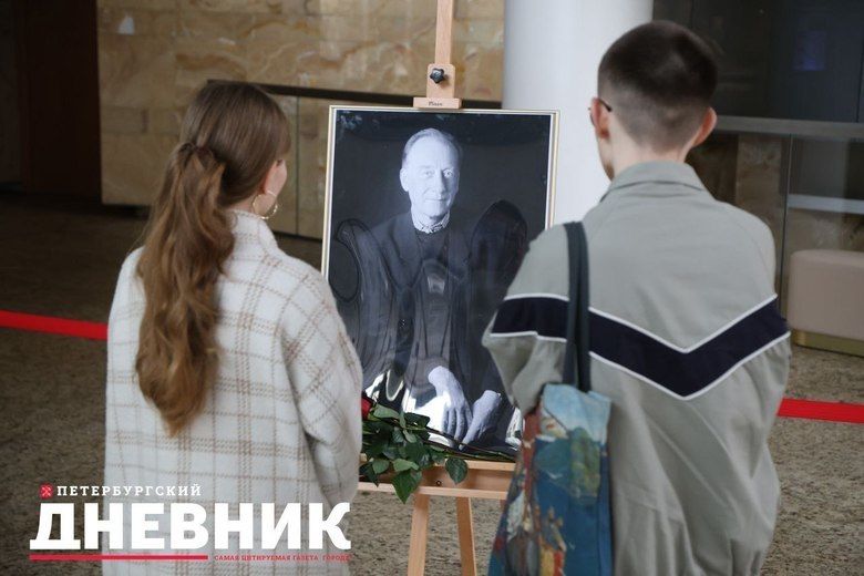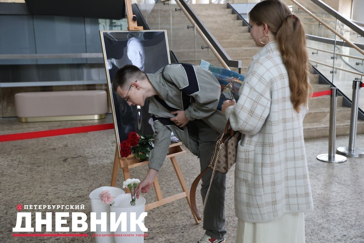 Рядом с главной лестницей сотрудники театра установили большой черно-белый портрет композитора и рядом с ним вазоны для цветов. На кадрах, которые сделал фотограф «Петербургского дневника», можно заметить, что неравнодушные люди уже приносят букеты.