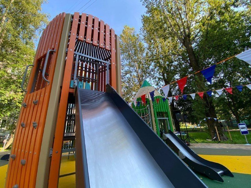 Инновационным решением стало оснащение новой детской площадки оригинальным игровым комплексом. Маленьких жителей радует необычная «горка-карандаш» с подвесным мостом, развивающие бизиборды, обучающий алфавит и безопасная детская горка.