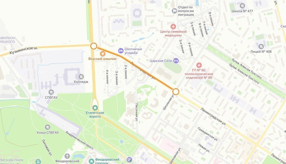 В Пушкинском районе сегодня ограничено движение по Ленинградской улице от Петербургского шоссе до Школьной улицы, с 3 по 6 сентября закрывается движение по Ленинградской улице на том же участке, включая перекрестки с боковым проездом Петербургского шоссе и с улицей Вячеслава Шишкова.