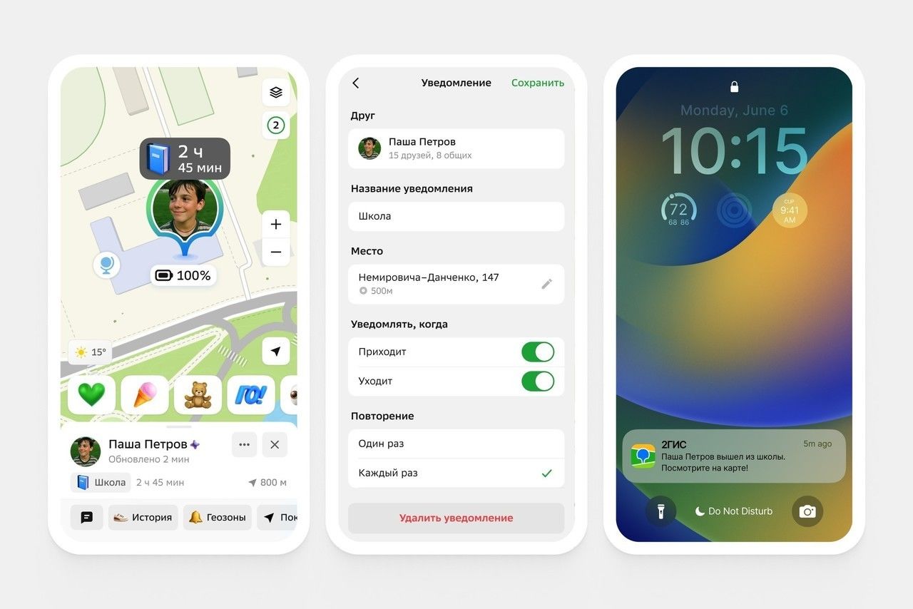 В приложении предусмотрена настройка уведомлений о прибытии или убытии близких из определенного места – для уверенности, что ребенок добрался до секции или что супруг покинул работу и направляется домой.