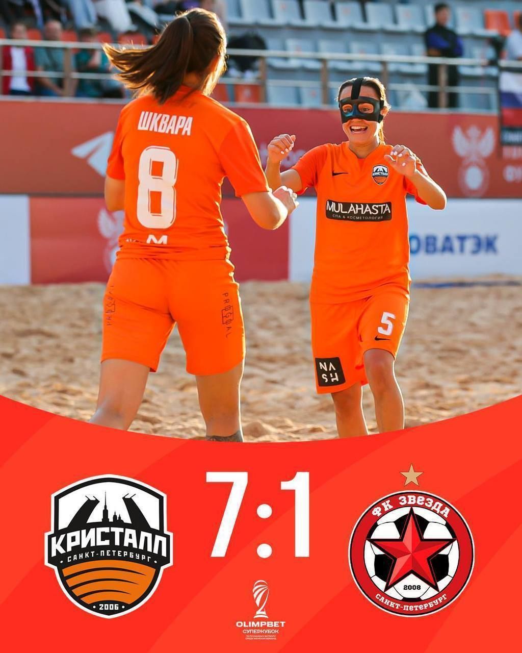 В Санкт-Петербурге разыграли Суперкубок по пляжному футболу среди женских команд. Встретились чемпион и обладатель Кубка страны «Кристалл» и серебряный призёр чемпионата «Звезда».