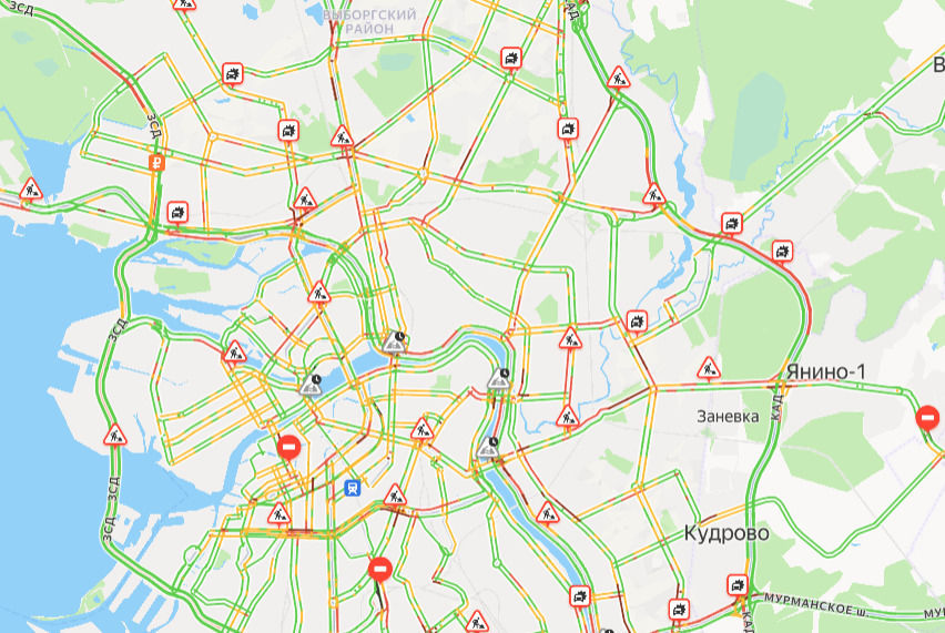 Сервис «Яндекс Пробки» показывает, что водители застряли на внутреннем участке кольцевой от Мурманского шоссе, через вантовый мост, минуя Обухово и прямиком до Софийской улицы.