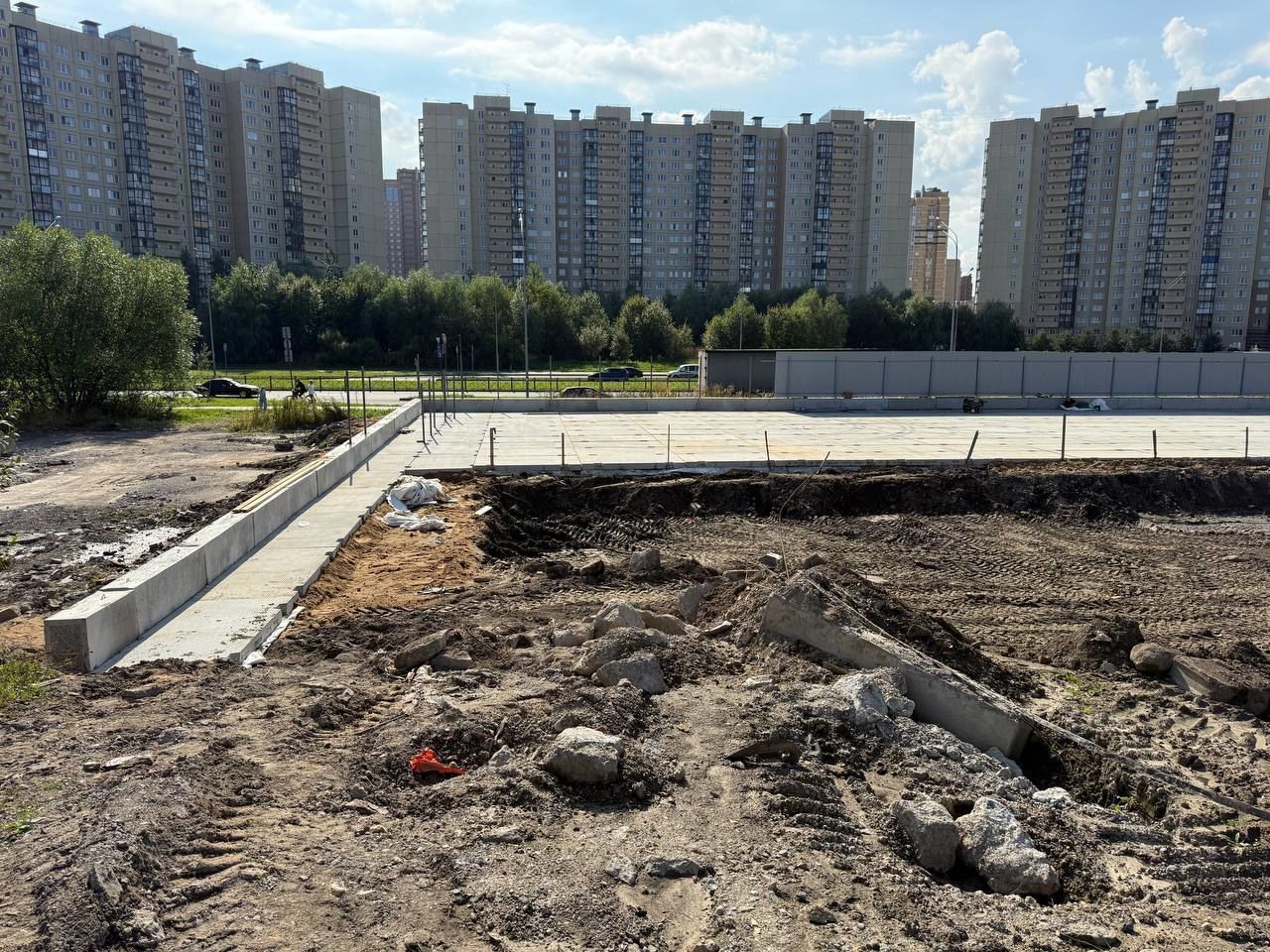 Вдоль улицы Маршала Казакова устанавливают строительное ограждение и укладывают дорожные плиты. Освоение площадки началось 2 августа 2024 года в районе перекрёстка с проспектом Кузнецова.
