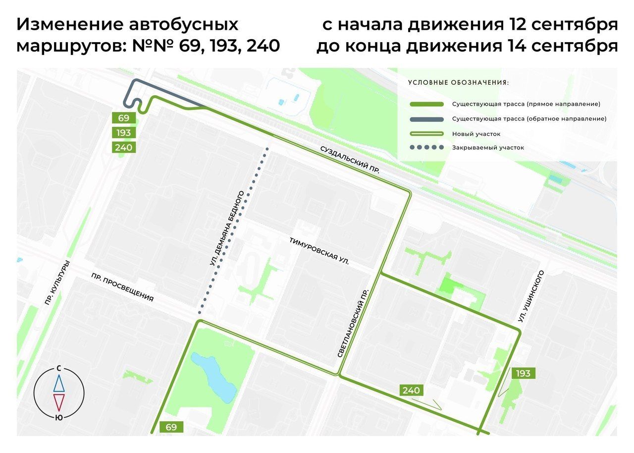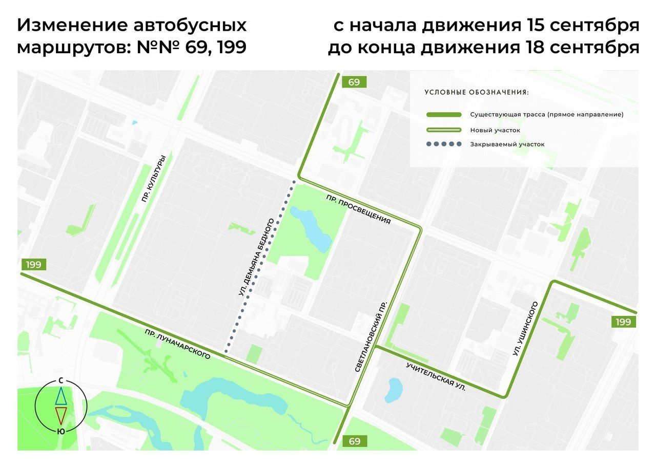 С начала движения 15 сентября до конца движения 18 сентября изменятся трассы автобусных маршрутов № 69, 199, сообщили в СПб ГКУ «Организатор перевозок».