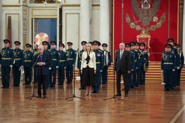 Одна из самых красивых церемоний культурного форума проходит уже в третий раз. Обладателями престижной награды становились основатель и руководитель театра балета Борис Эйфман и дипломат народный артист Азербайджана Полад Бюльбюль Оглы. А в 2023 году – худрук балетной труппы Михайловского театра Хуан Игнасио Дуато Барсиа и художественный руководитель Мариинского театра Валерий Гергиев. Кстати, именно он вместе с министром культуры Ольгой Любимовой и председателем Геральдического совета при президенте РФ Георгием Вилинбаховым вошел в зал, где и происходило волнующее событие. А самыми первыми под звуки военно-духового оркестра штаба Северо-Западного округа войск Национальной гвардии под управлением подполковника Евгения Чубарева там появились заместитель председателя правительства РФ Татьяна Голикова, губернатор Санкт-Петербурга Александр Беглов и генеральный директор Государственного Эрмитажа Михаил Пиотровский.