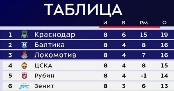 На данный момент сине-бело-голубые с 13 очками находятся на шестом месте. А на первой строчке располагается «Краснодар», который набрал 19 очков. На второй строчке с 16 очками – «Балтика», третью позицию, также с 16 очками, занимает московский «Локомотив».