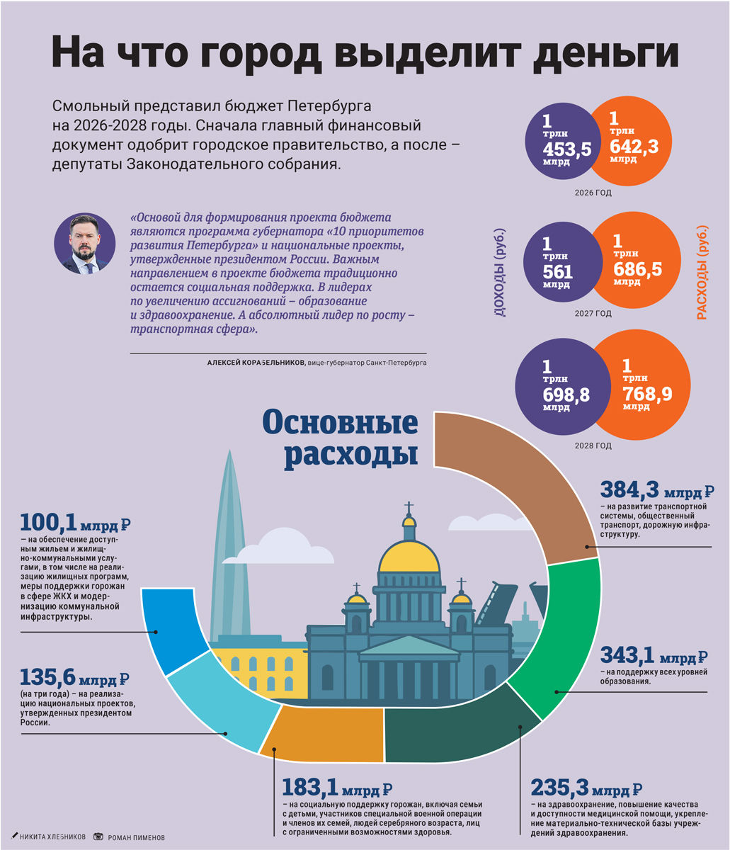 «Основой для формирования проекта бюджета являются программа губернатора «10 приоритетов развития Петербурга» и национальные проекты, утвержденные президентом России. Важным направлением в проекте бюджета традиционно остается социальная поддержка. В лидерах по увеличению ассигнований – образование и здравоохранение. А абсолютный лидер по росту – транспортная сфера», – сказал вице-губернатор Санкт-Петербурга Алексей Корабельников.