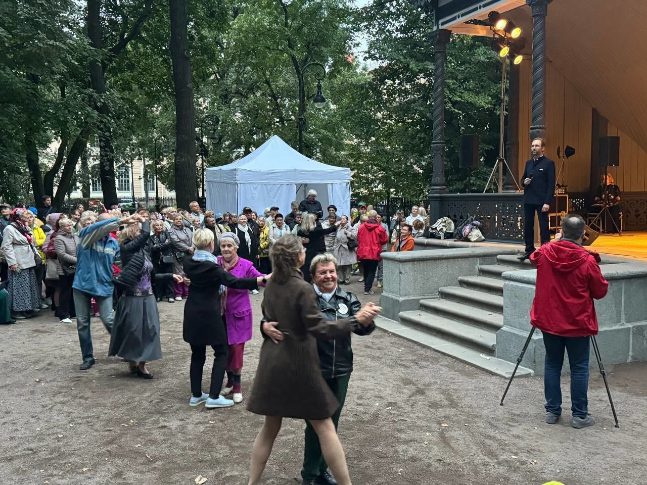 «И дождя нет, и ветер не дует. Мягкая такая, сумрачная погода с пробивающимися лучами солнца. Прекрасно. Мне очень нравится эта идея, можно сказать, ретроидея в новом исполнении. Это замечательно: люди приходят в парк, звучат песни, все танцуют, общаются, работают фонтаны», – отметила Марина Цхай.