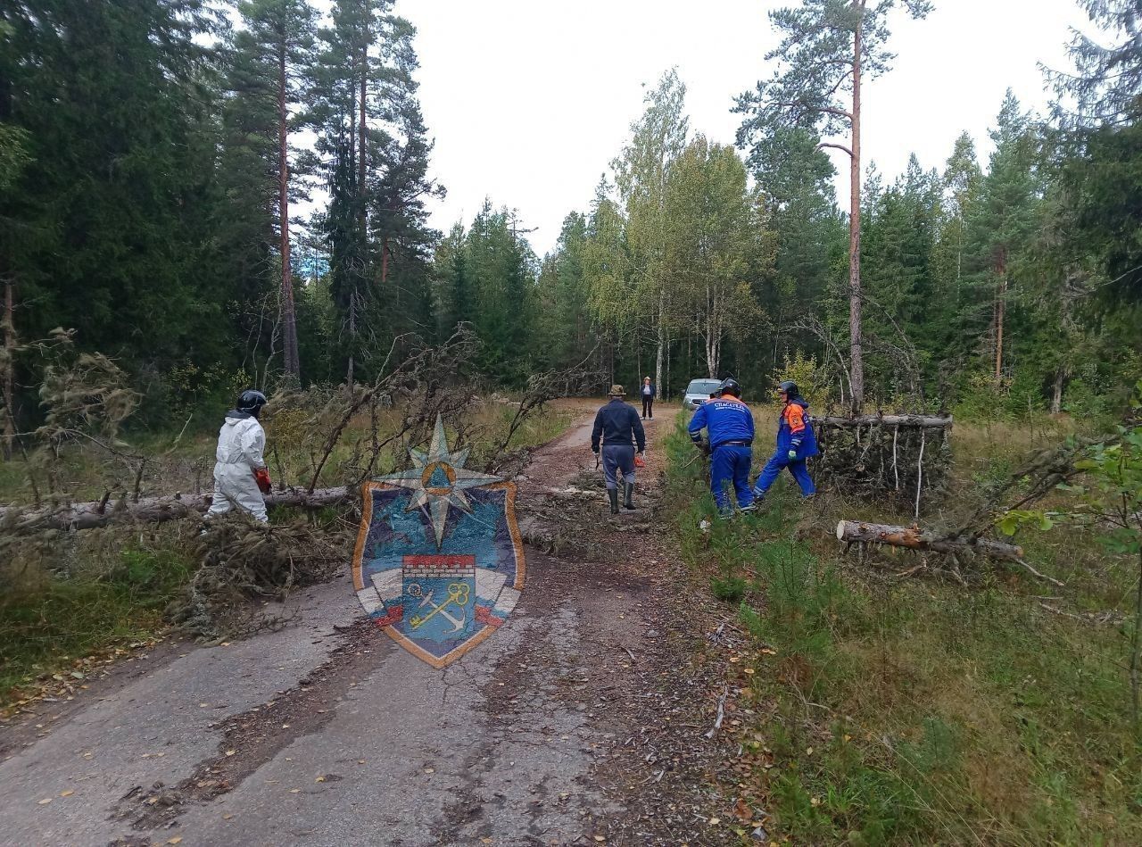 Спасатели провели работы в Приозерском районе Ленинградской области. Там в районе 106-го км Приозерского шоссе деревья упали прямо на дорогу, чем помешали проезду машин.