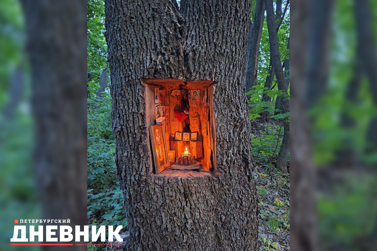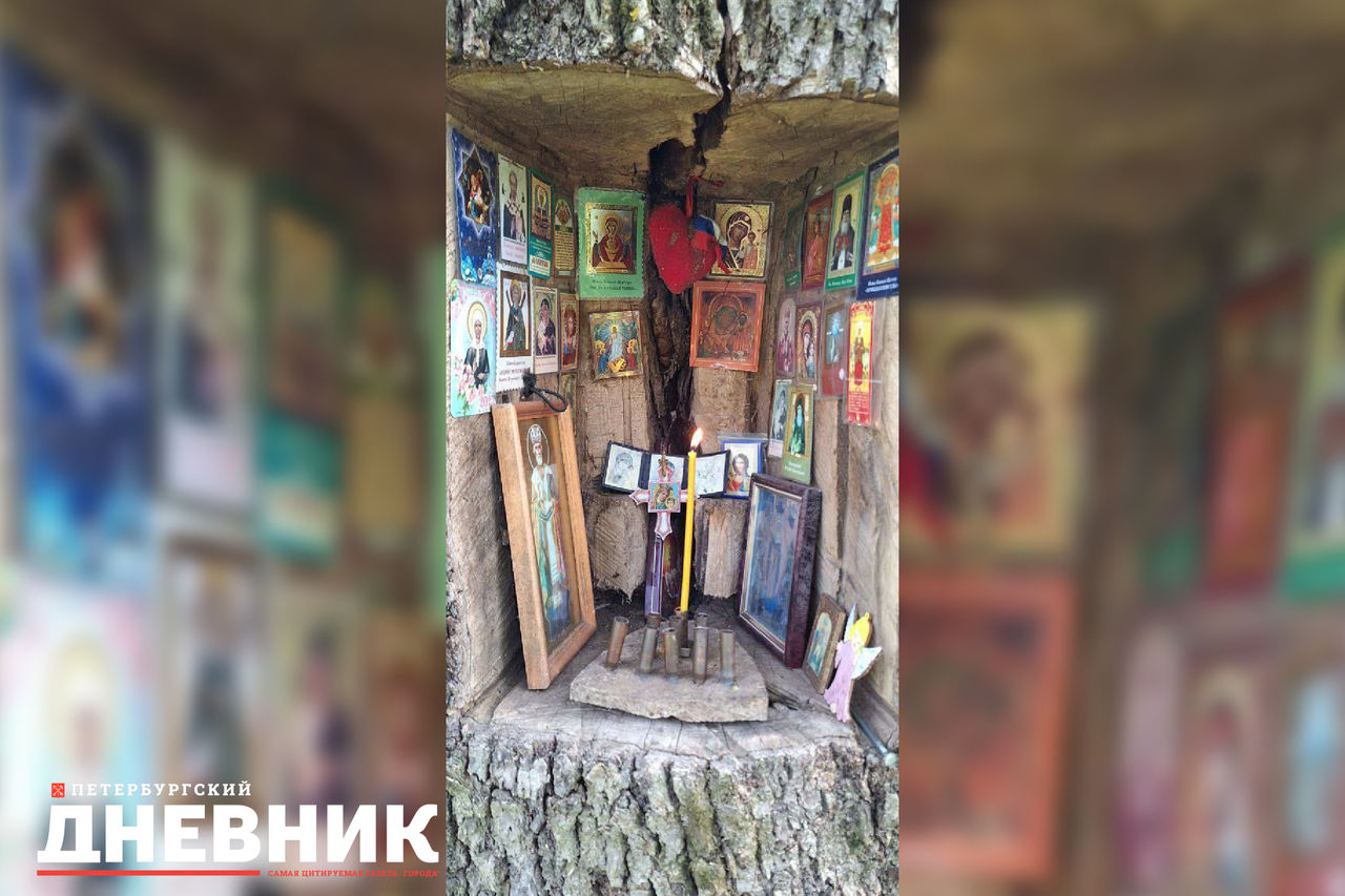 Военнослужащий из Ленинградской области с позывным «Зефир» рассказал, что на их территории создали место для молитвы прямо в дупле дерева. Настоящий иконостас. Солдаты выпилили большое дупло в массивном дереве и там разместили иконы, которые привезли с собой из дома.