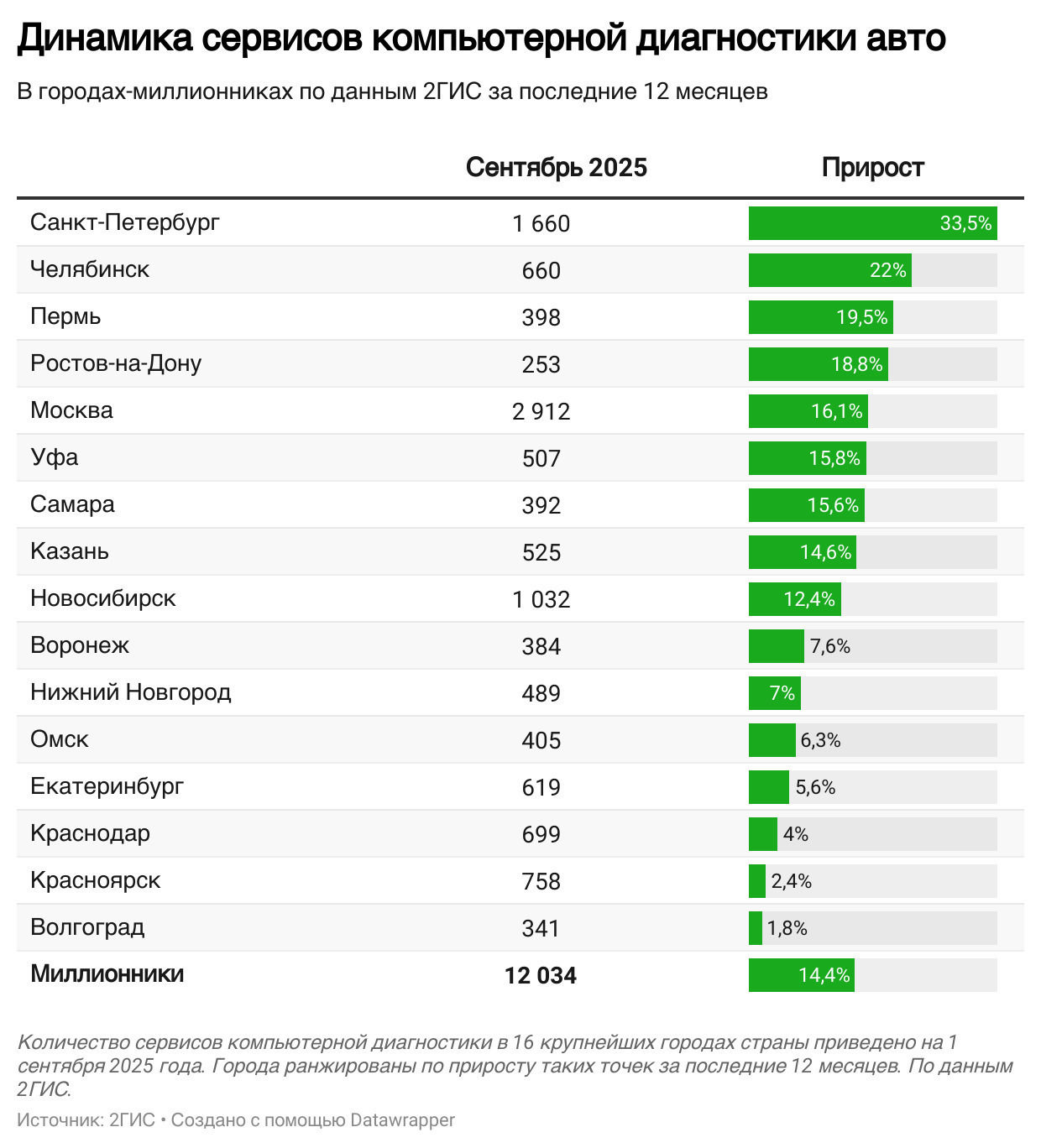 В России за год в городах-миллионниках выросло число сервисов компьютерной диагностики авто на 14%. В пятерку мегаполисов с наибольшим приростом вошли Санкт-Петербург, Челябинск, Пермь, Ростов-на-Дону и Москва, следует из данных геосервиса 2ГИС.