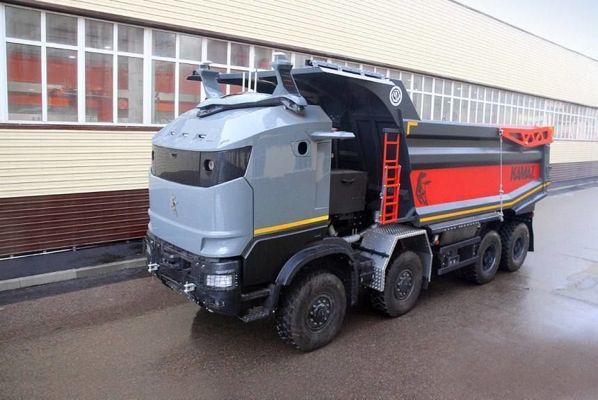 У самосвала отсутствуют двери и руль, а в кабине нет водителя. Новый КамАЗ полностью управляется дистанционно.
