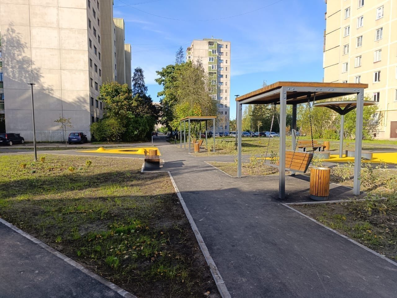 Здесь сделали освещение пешеходной дорожки, установили скамейки, батуты, артобъект и качели, обустроили заезды на пешеходную зону для маломобильных жителей, установили ограждения.