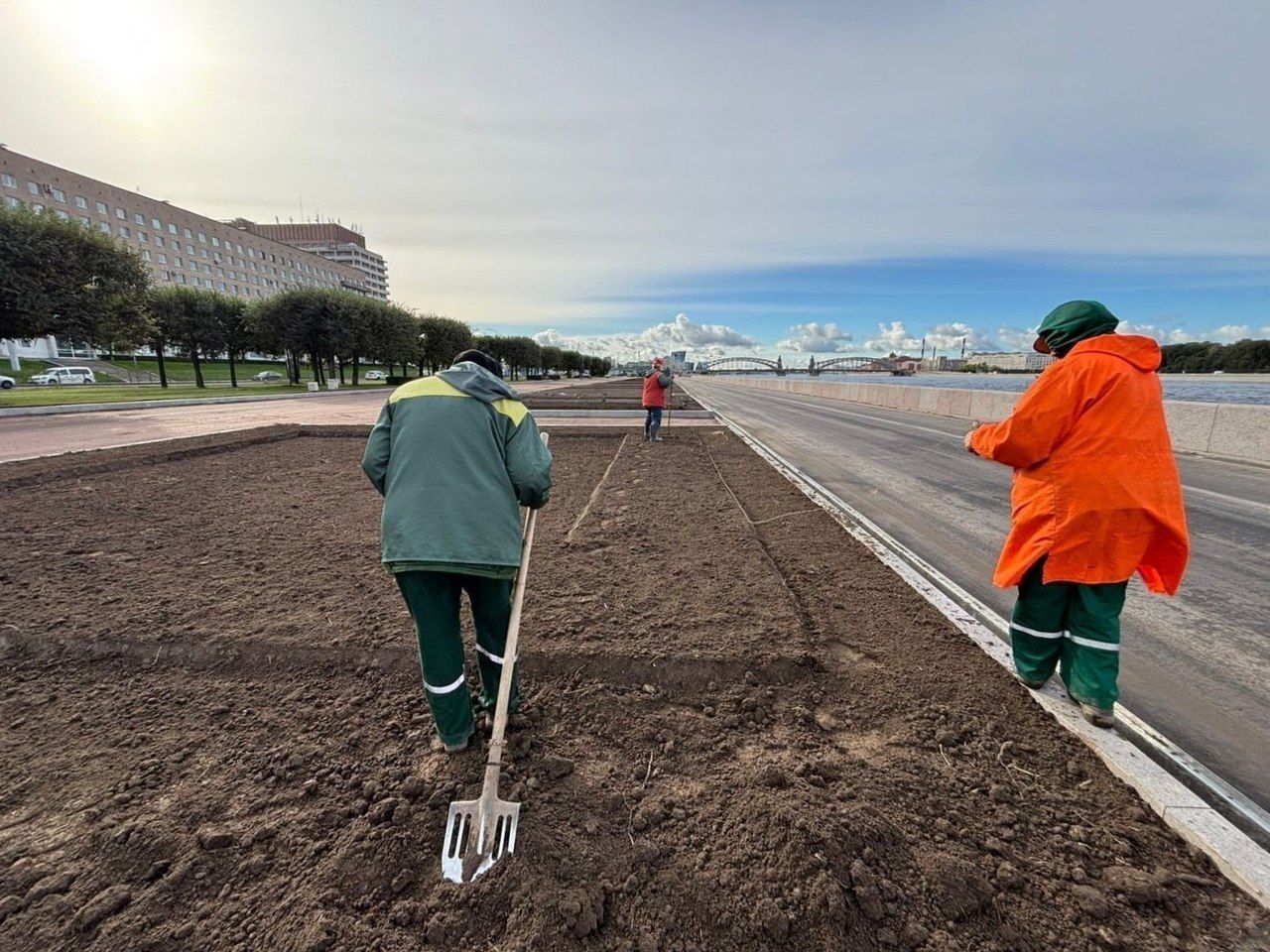 В настоящее время специалисты садово-паркового предприятия «Охтинка» приводят в порядок газоны и подготавливают места для высадки кустарников.