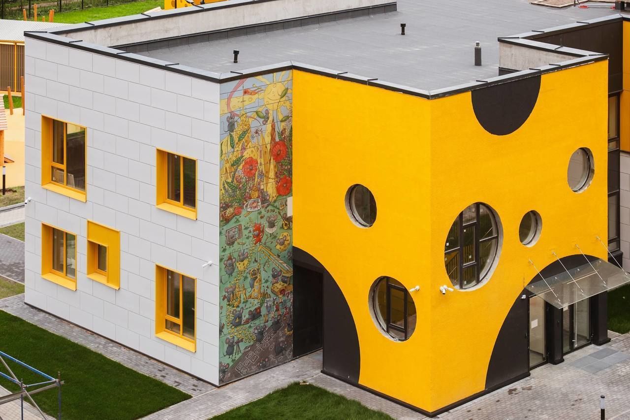 Как сообщает Piter.TV, в детском саду оборудованы игровые и спортивные площадки, музыкальный и физкультурный залы, групповые помещения, современная кухня и комнаты для малышей. Сыр в интерьере символизирует радость и комфорт домашнего очага.