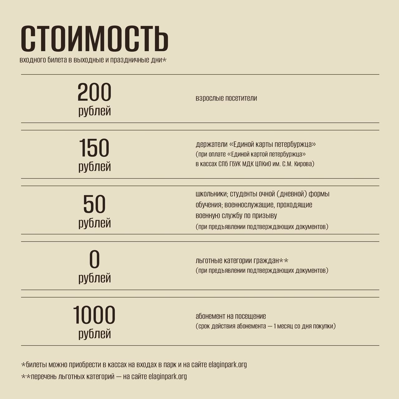 С 4 октября 2025 года на выходные и праздничные дни изменяется стоимость входных билетов в Центральный парк культуры и отдыха на Елагином острове в Санкт-Петербурге. Для взрослых новая цена составит 200 рублей. Владельцы «Единой карты петербуржца» смогут приобрести билет по сниженной цене 150 рублей. Также появится возможность оформить месячный абонемент за 1000 рублей.