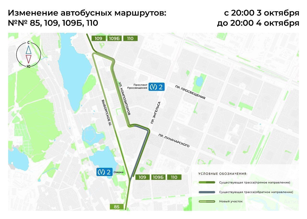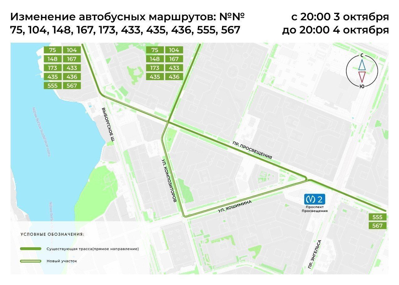 В Петербурге в связи с дорожными работами на Выборгском шоссе с 20:00 3 октября до 20:00 4 октября вносятся изменения в трассы автобусных маршрутов №75, 85, 104, 109, 109Б, 110, 148, 167, 173, 180, 259, 397, 433, 435, 436, 555, 567.