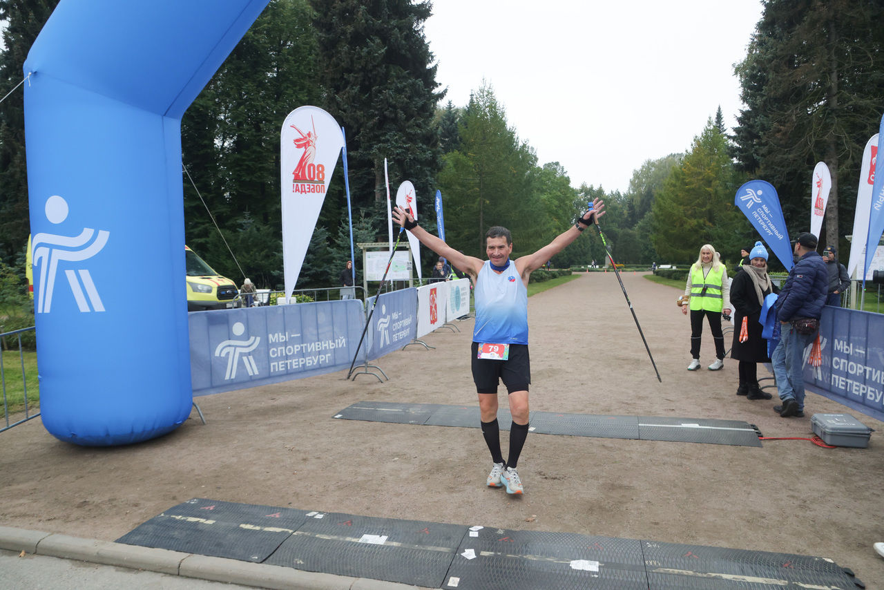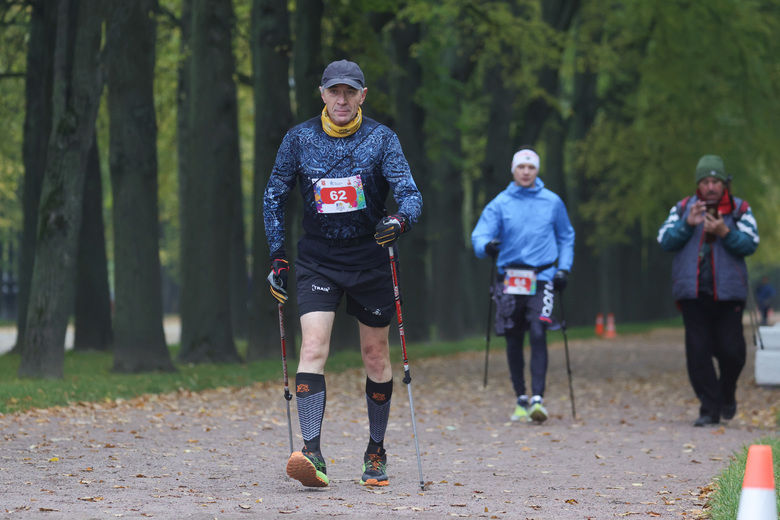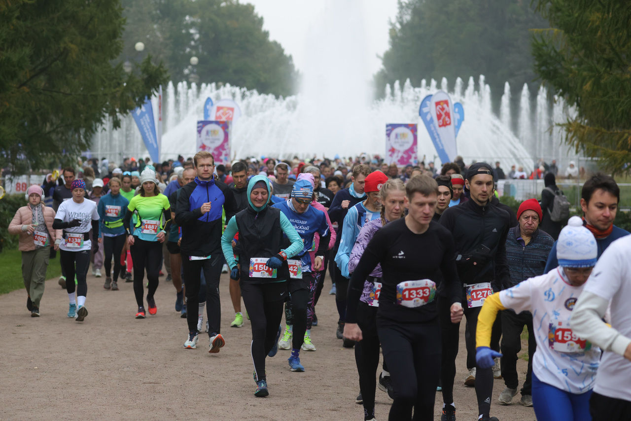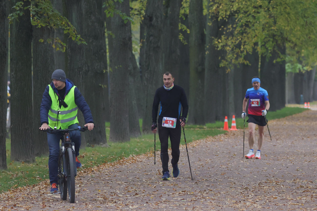 Прохладное осеннее утро на Крестовском острове. Деревья ещё не обнажились, но дорожки и газоны в Приморском парке Победы усыпаны жёлтыми листьями. Цветовую гамму октября разбавляют красно-белые конусы, установленные для обозначения трассы, на которой сегодня здесь проходят массовые соревнования Дня ходьбы.