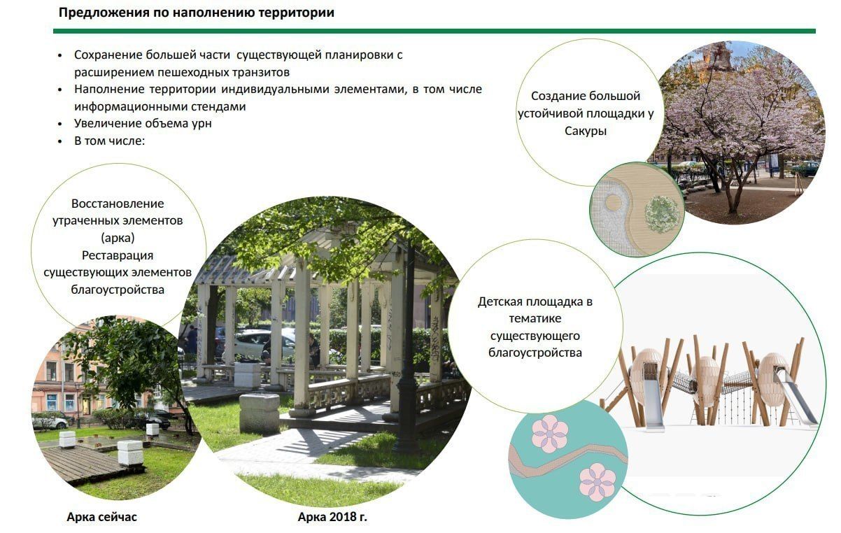 «Здесь планируется сохранить большую часть существующей планировки, расширить пешеходные транзиты, восстановить утраченные и привести в порядок существующие элементы благоустройства, обустроить тематическую детскую площадку», – говорится в сообщении.