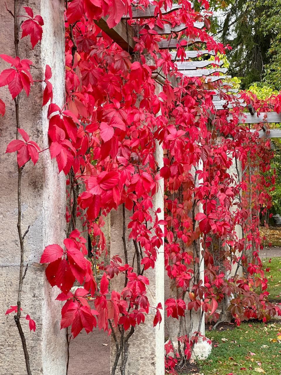 Пресс-служба вице-губернатора Евгения Разумишкина опубликовала в телеграм-канале фотографии розовых листьев винограда, которые обвивают перголу.