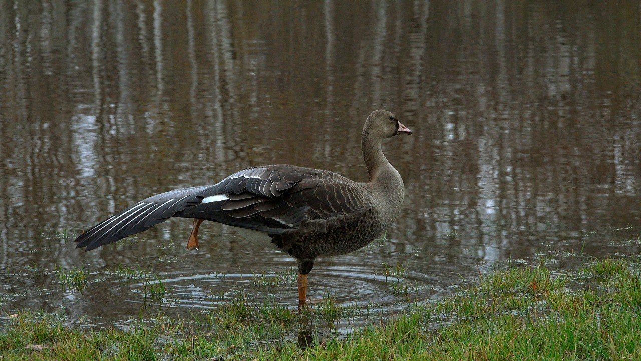 В Приморском районе Петербурга запечатлели молодого белого гуся бололобика, у которого к весне появится на лбу белое пятно. По каким-то причинам птица отстала от своей стаи и решила отдохнуть в Северной столице. Об этом в своем телеграм-канале «Каждой твари по паре» рассказал петербургский биолог Павел Глазков.